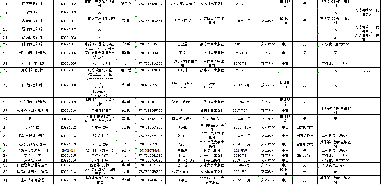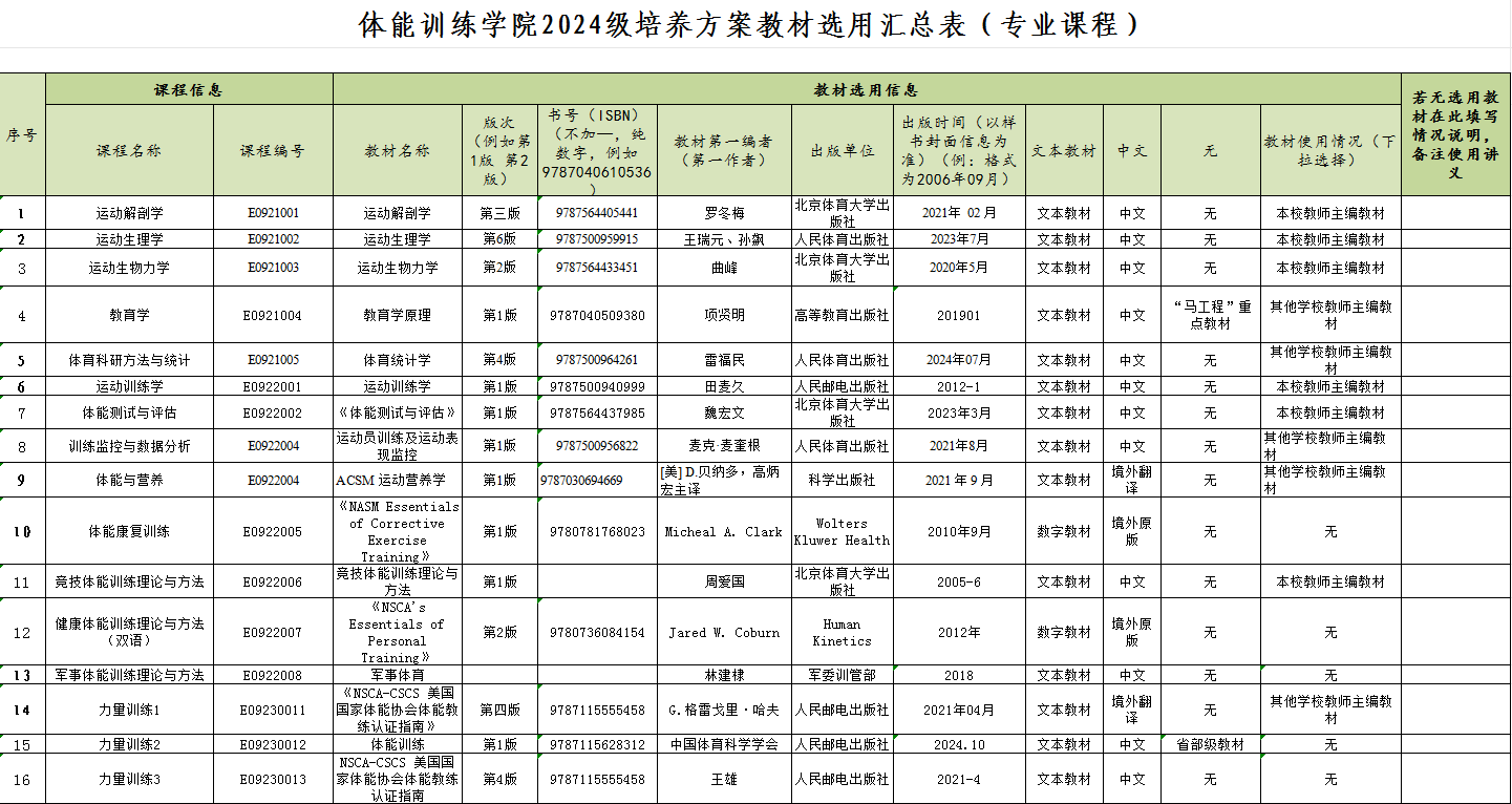 体能训练学院2024级培养方案教材选用汇总表(专业课程)