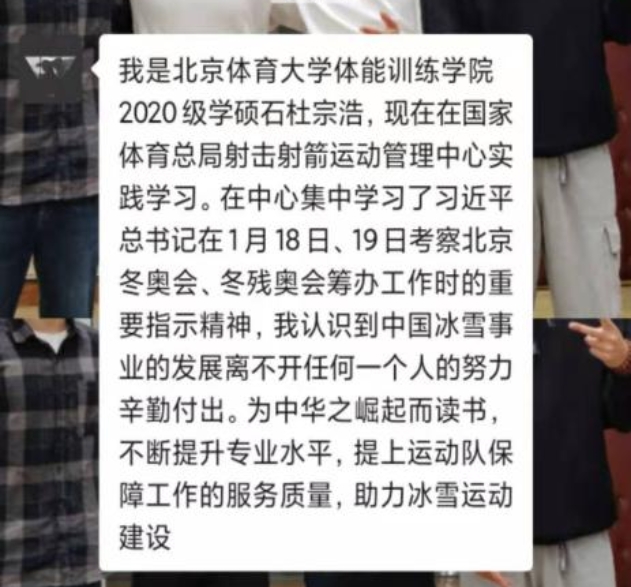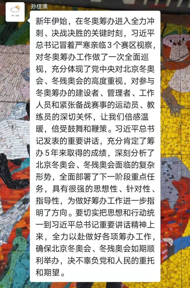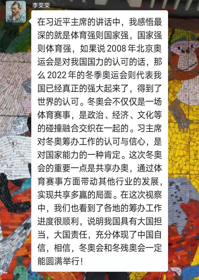 总书记亲自视察指示筹备工作,说明了对体育的重视,对冰雪运动的重视,这也是对我们体育人的期盼。现在体能训练学院有一部分同学在冰雪项目队伍中服务,希望能把我们在平时学习以及训练中,把自己的经验以及把书本上的知识,与实践能结合起来,基础体能服务好专项体能,提高运动员的运动表现。(2018年硕士研究生申铄)