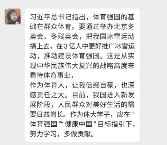 通过这个学习,我感受到了党和国家对于体育的重视。我作为一名体能训练学院的学生,一方面还是希望通过自己的不断学习,利用所学到的知识,为冬奥来贡献一份自己的力量。另一方面,像习近平总书记所说的,冬季项目还不够普及,大众化还不太够,如果说我能有这样的机会,尽我自己的能力为大众体育也做出贡献。最后我也是很希望自己能够作为家门口的冬奥会的一名志愿者,来服务于运动员和观众。(2017级本科生杨雨柔)