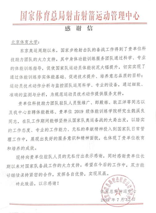 在东京奥运周期中,我院教师谢永民、博士研究生郎殿栋、硕士研究生魏溪良、张维广等多位硕士研究生服务国家射击队,保障运动员体能训练。疫情期间,我院师生克服困难,与运动队同吃同住同训,以专业的工作能力、踏实的工作态度、无私的奉献精神全力保障运动员备战东京奥运会。我院师生多次受到国家体育总局射击射箭运动管理中心致信感谢。