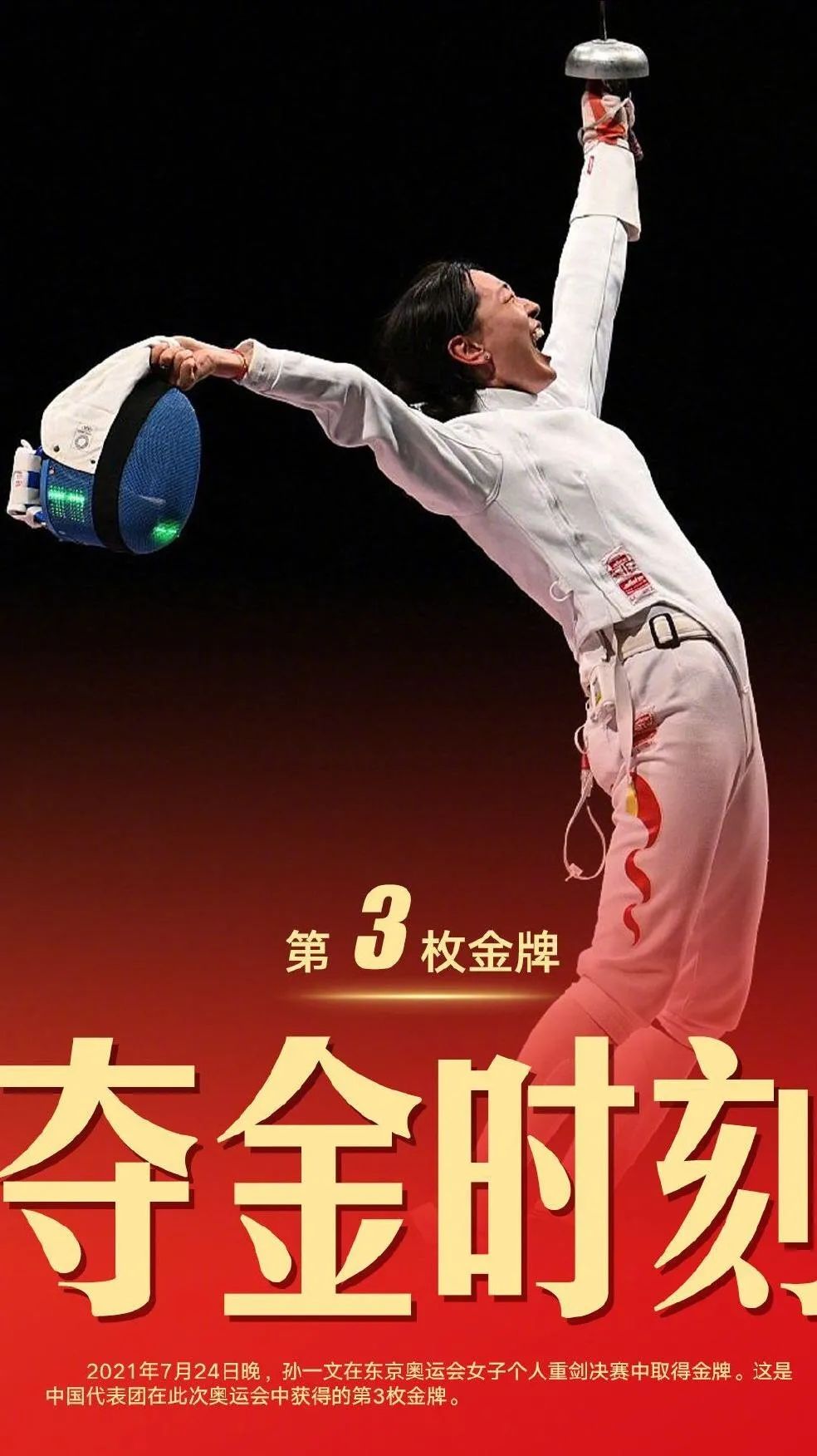 7月24日,东京奥运会正式展开首个比赛日的奖牌争夺。中国选手杨倩以251.8环夺得射击女子10米气步枪项目金牌,为中国队夺得东京奥运会首金,并创造了新的奥运会纪录!同日,在东京奥运会女子重剑个人决赛中,中国队孙一文最终一击制胜,一剑封喉,获得女子重剑个人金牌。这是中国女子重剑在奥运历史上的首枚金牌,也是中国代表团的第三枚金牌。