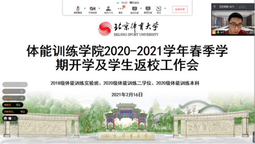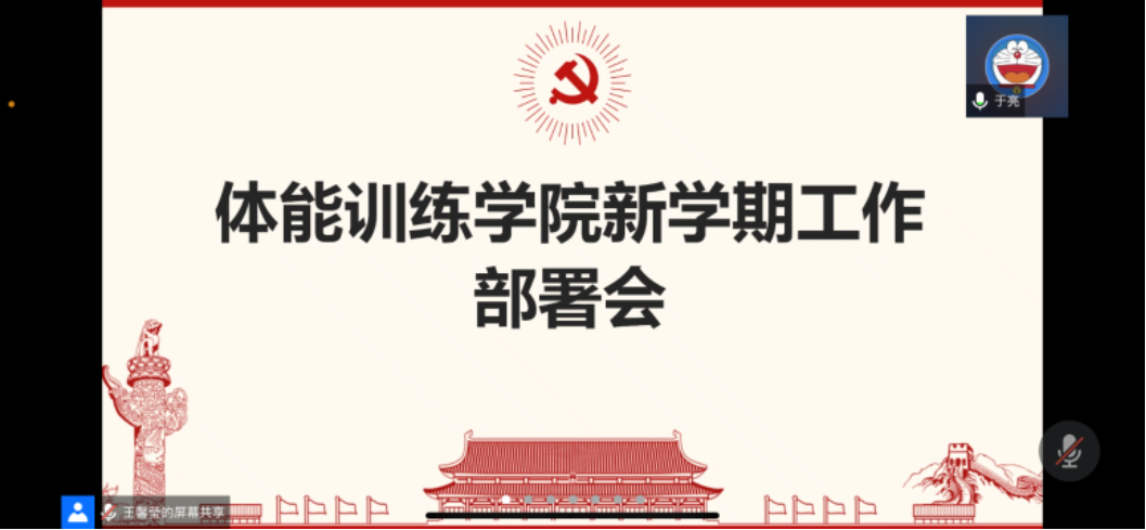 2021年2月15日晚7点半,体能训练学院在线上召开新学期工作部署会,针对学校下发新学期开学季学生返校安排的通知要求,统一安排学院新学期学生返校、授课以及学院未来计划等工作。会议由体能训练学院直属党支部书记于亮主持,全体教师参会。